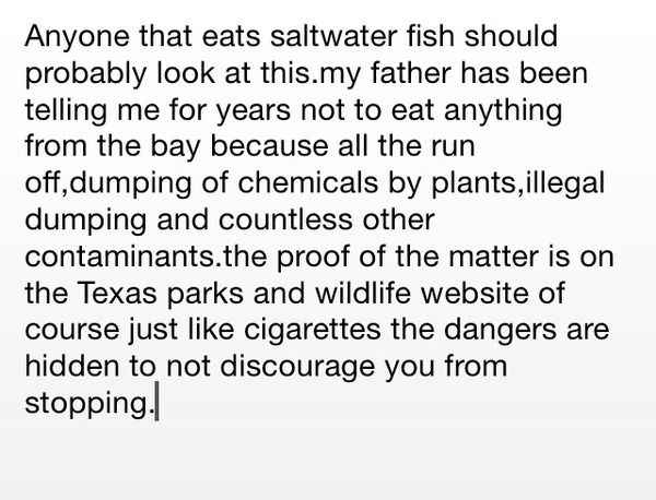 Anyone that eats saltwater fish should probably look at this.my father has been telling me for years not to eat anything from the bay because all the run off,dumping ...more of chemicals by plants,illegal dumping and countless other contaminants.the proof of the matter is on the Texas parks and wildlife website of course just like cigarettes the dangers are hidden to not discourage you from stopping.