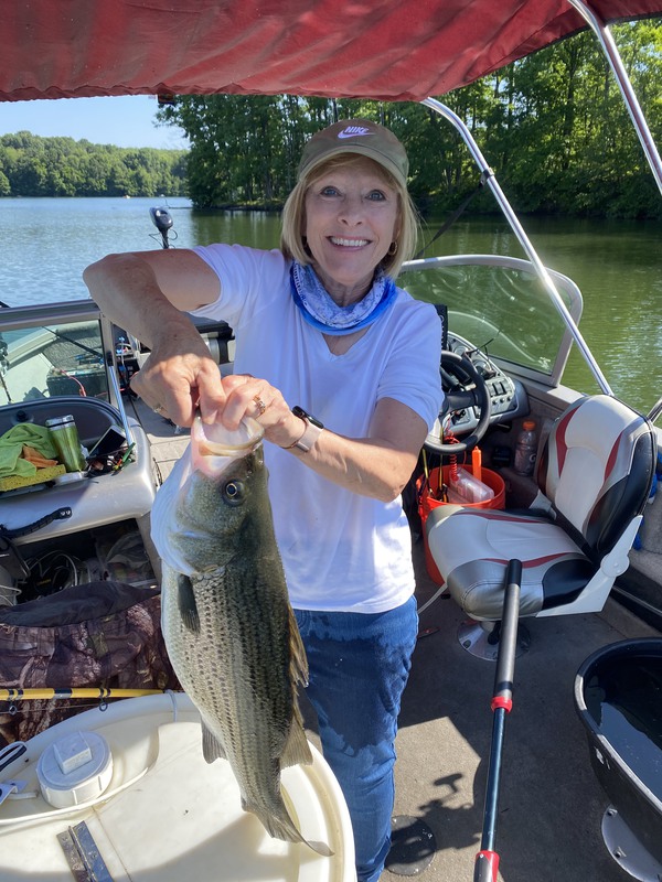 We had a good morning. Wifey Jeanie caught her personal best hybrid. 28 inches. She landed 5 nice ones today. It was lots of action so maybe she come fishing more😉