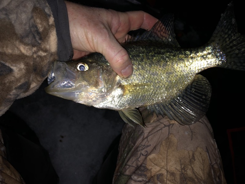 Stayed two hours after sunset. Full moon. 12 plus inches of ice with 6 inches of snow on top. 9.5 feet of water off Stoney Point. Jigged about a foot off bottom. ...more Most crappies came from bottom and would follow it up. One yellow bass hour and half after sunset. Added wax worms to lures. Perch before sunset. Very little wind helped to hole hop