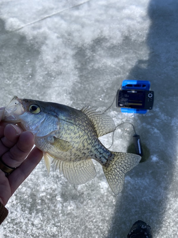 Got out for a couple hours this afternoon. First time ice fishing this lake. Found small crappie and blue gill in 13’ of water.