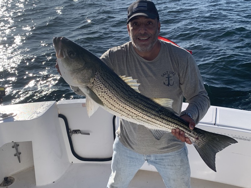 Went fishing π£ on the Manasquan Inlet north jetty this evening on a cool, sunny day with a strong south wind and low tide. It wasnβt crowded. Only one surfer πββοΈ ...more was there. Caught, tagged and released a windowpane flounder on my first cast of the day with a very old, stainless steel Jap metal. Then caught, tagged and released a 19β smooth nose skate with the metal. Caught, tagged and released a second flounder on the metal. Then caught, tagged and released an 18β skate with the metal. On my next and last cast of the day, I caught, tagged and released a 29β striped bass with my brother Johnβs homemade synthetic black and white buck tail teaser. After sunset, hickory shad jumped out of the ocean while chasing glass minnows. Caught fish π on my last 18 trips to Manasquan.