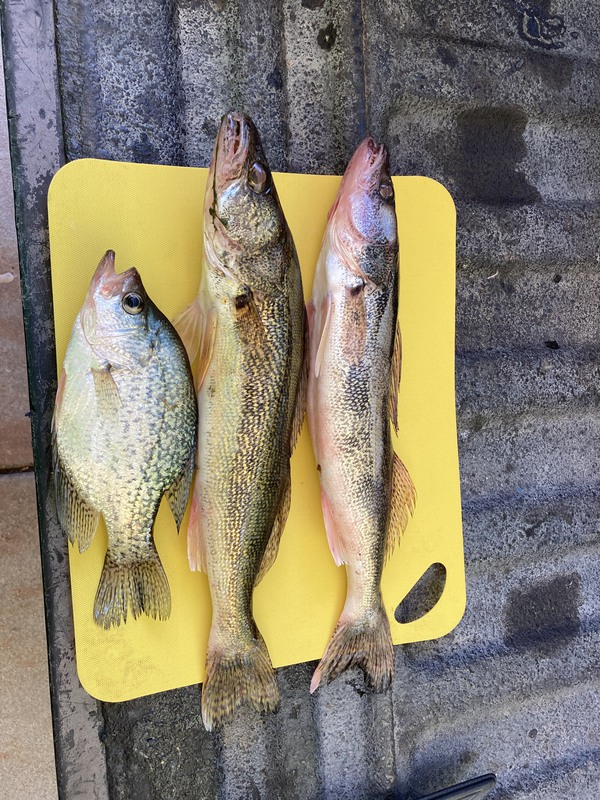 53 crappies, 19 gills, 1 9 lb blue cat and 1 small bass on slip bobbers fishing 10 ft down in depth of 13 to 20 ft. minnows and wax worms, also lindy frostee spoon ...more under boat caught numerous fish, kept these for supper