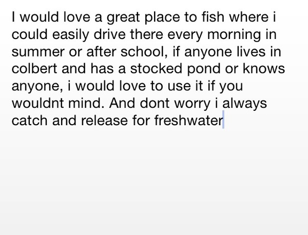 I would love a great place to fish where i could easily drive there every morning in summer or after school, if anyone lives in colbert and has a stocked pond or ...more knows anyone, i would love to use it if you wouldnt mind. And dont worry i always catch and release for freshwater