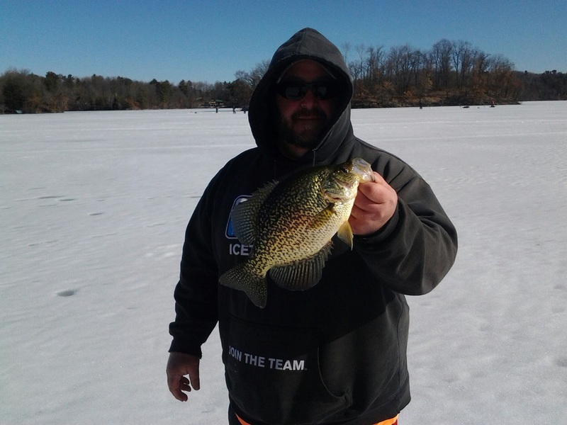 12 1/2" Krappie(lol). Looks bigger from close up pic!!! Late afternoon outing going solo with my tracking dog, Coco, after having a Stroke this past November. ...more Amazing what "Ice Fishing" alone with man's best friend does for the mind, body and soul!!!