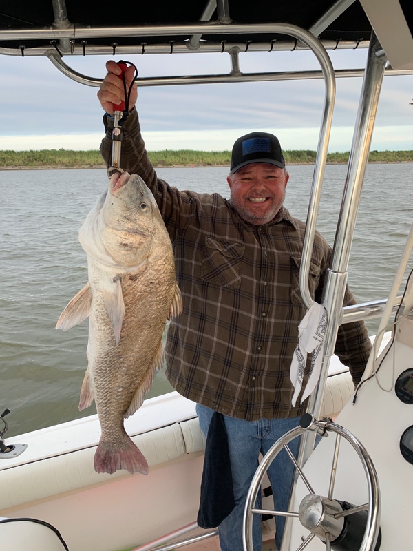 56 lb. 5 oz. 42 in. Black Drum with a gulp