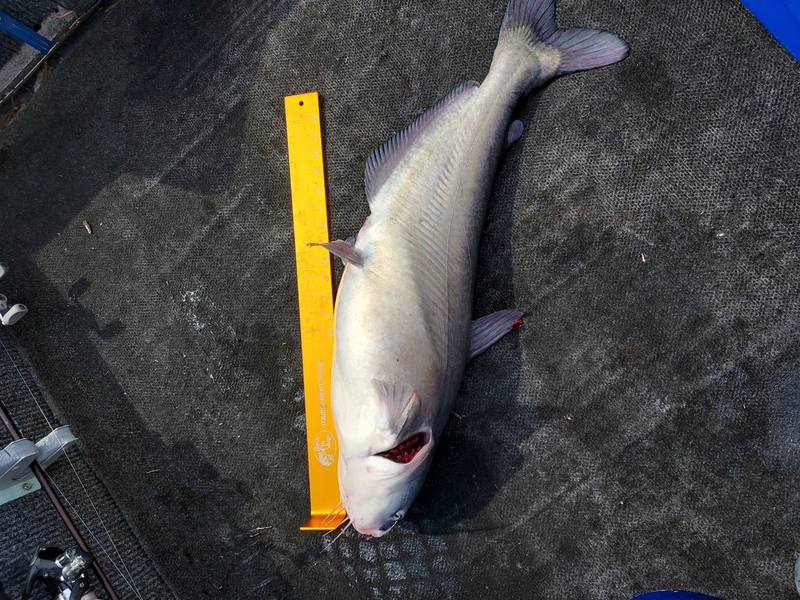 Caught a few small stripers and several nice keeper blue catfish jigging around bridge pilings. Great day on the river today !