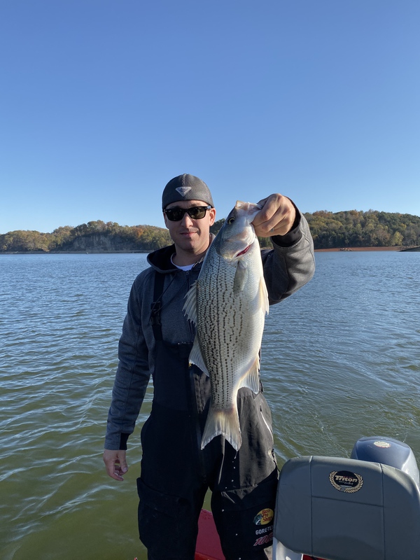 8 lb. Hybrid Striped Bass with a alewife shad