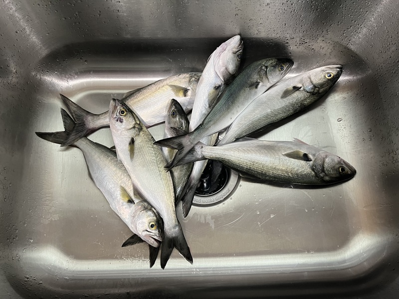 1. 9-13 inch snappers (baby blues) in surf Beach Haven, NJ 6 am 7/26/23 in an hour n half with straight metal spooner and my UglyStik , low tide. Threw smaller ones ...more back. Just clean, peel off skin after broiling and pull off backbone strip of meat (belly too bony) with sauteed tomatoes, garlic,onion,S/P in olive oil. Yum.