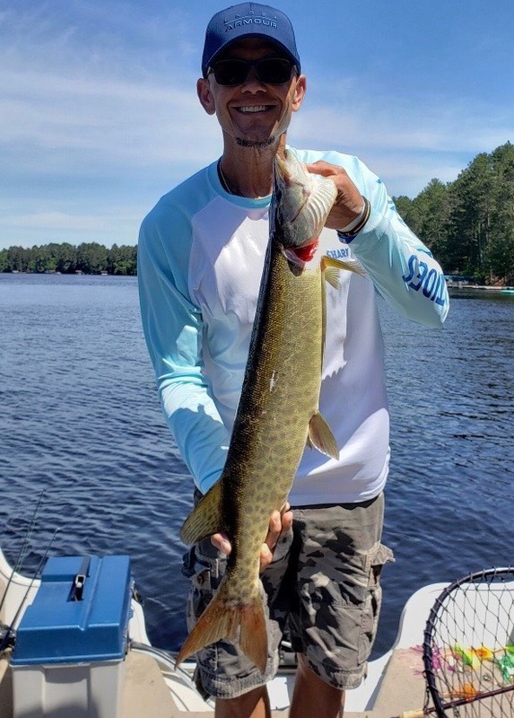 32 inch musky on the chain middle of day The rest of the week was unproductive. We saw lotta fish, I didn’t put any more in the boat. Cold front moved in middle ...more of the week and everything totally shut down Will be back up there in July or August