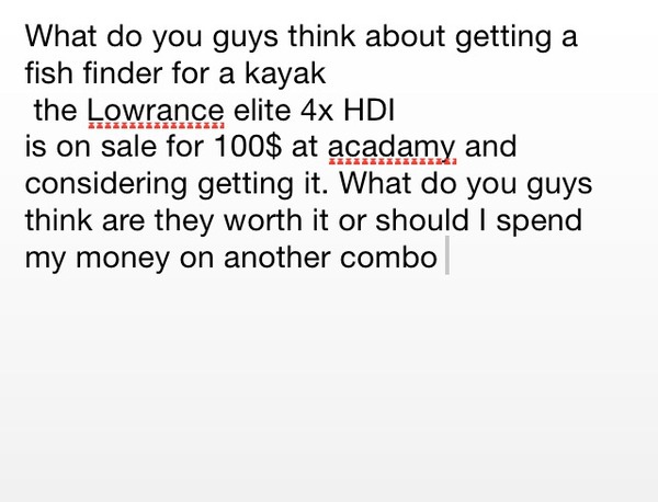What do you guys think about getting a fish finder for a kayak the Lowrance elite 4x HDI is on sale for 100$ at acadamy and considering getting it. What do you ...more guys think are they worth it or should I spend my money on another combo