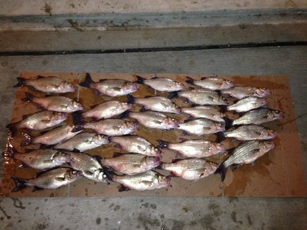 Yesterday's catches from the white bass spawn run at Somerville. From all of the cold weather the one warm day really got the fish goin. High of 70F, moderately ...more clear skies, lot of pitching getting around brush. Once you found a hole it was game over!