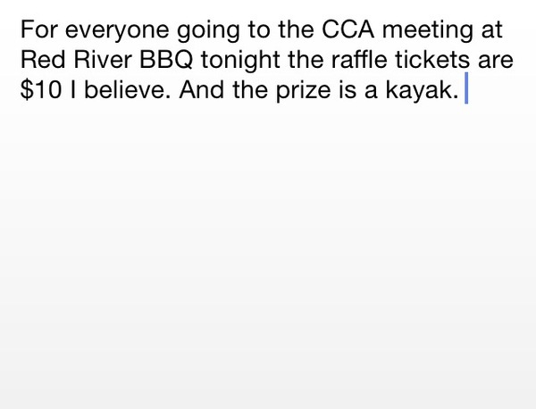 For everyone going to the CCA meeting at Red River BBQ tonight the raffle tickets are $10 I believe. And the prize is a kayak.