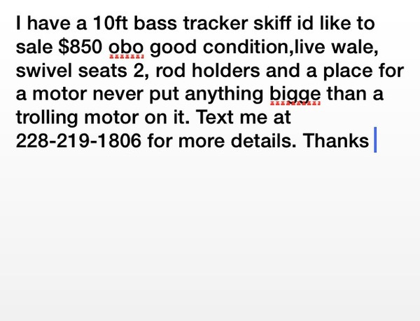 I have a 10ft bass tracker skiff id like to sale $850 obo good condition,live wale, swivel seats 2, rod holders and a place for a motor never put anything bigge ...more than a trolling motor on it. Text me at 228-219-1806 for more details. Thanks