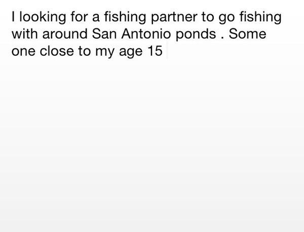 4. I looking for a fishing partner to go fishing with around San Antonio ponds . Some one close to my age 15