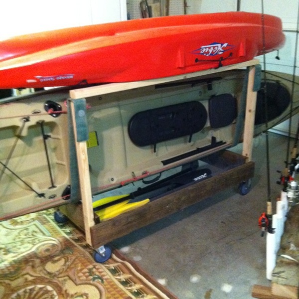 Finally got my yak's off the ground. Fire hose makes great straps and its free if you ask nicely and bring ice cream. Screen door material on the base to hold ...more stuff like paddles, seats.